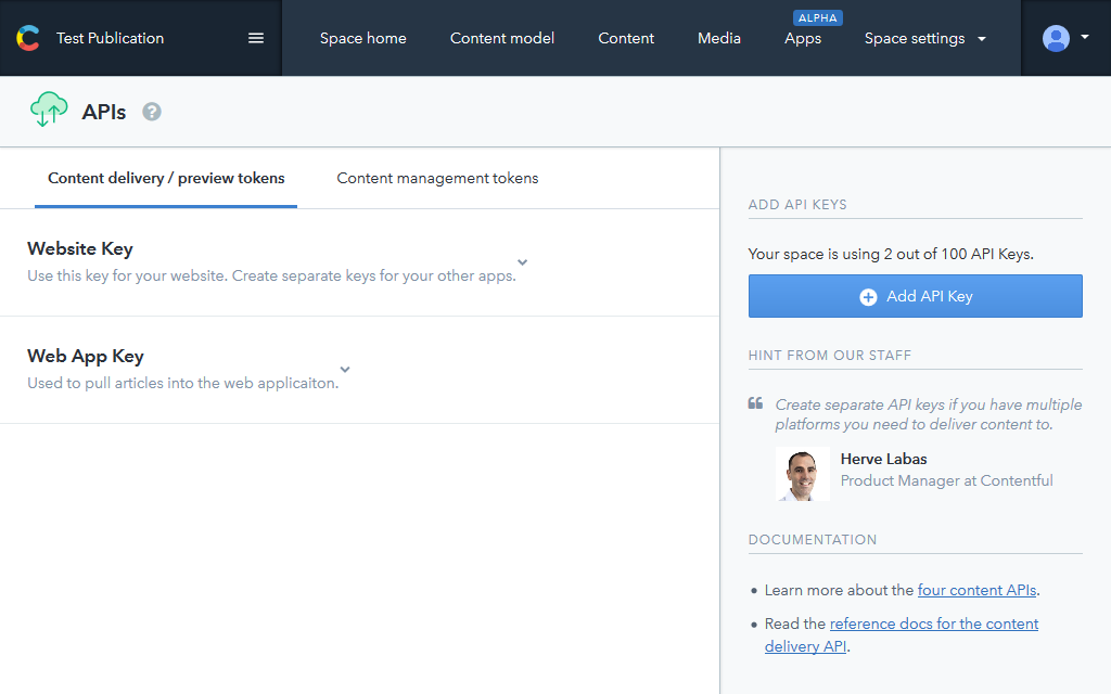- Content Delivery (REST) - A read-only API to deliver content to apps, websites and other media as JSON data, images, videos and other media files.