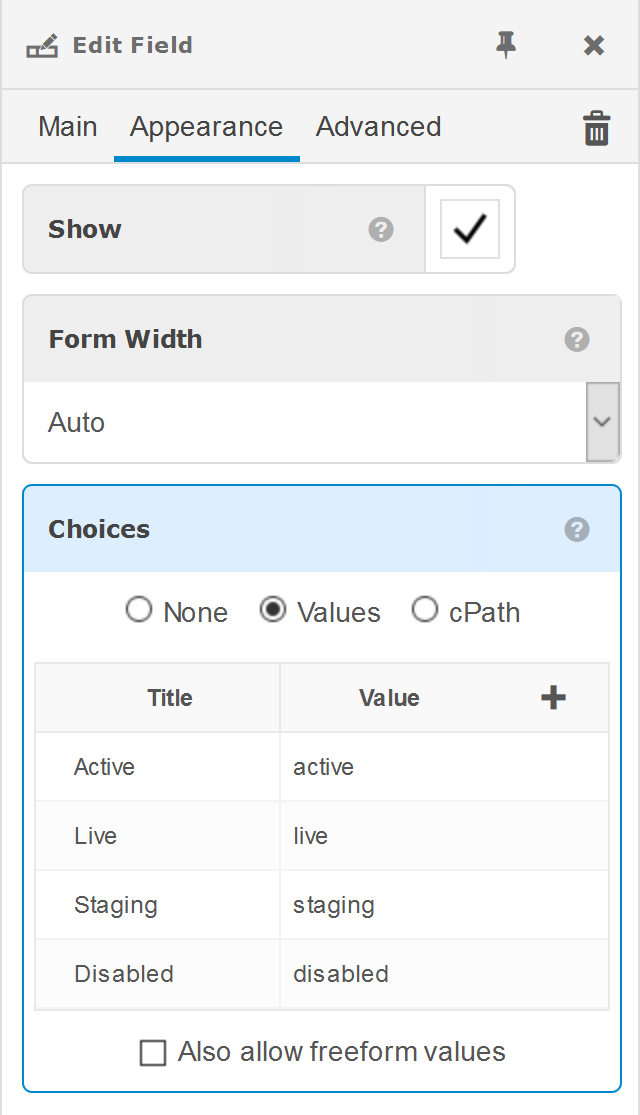 When Values is selected in step 3 above, any number of options can be entered, where each option has Title that is displayed in the drop-down menu and a value that will be assigned to the field when the option is selected.