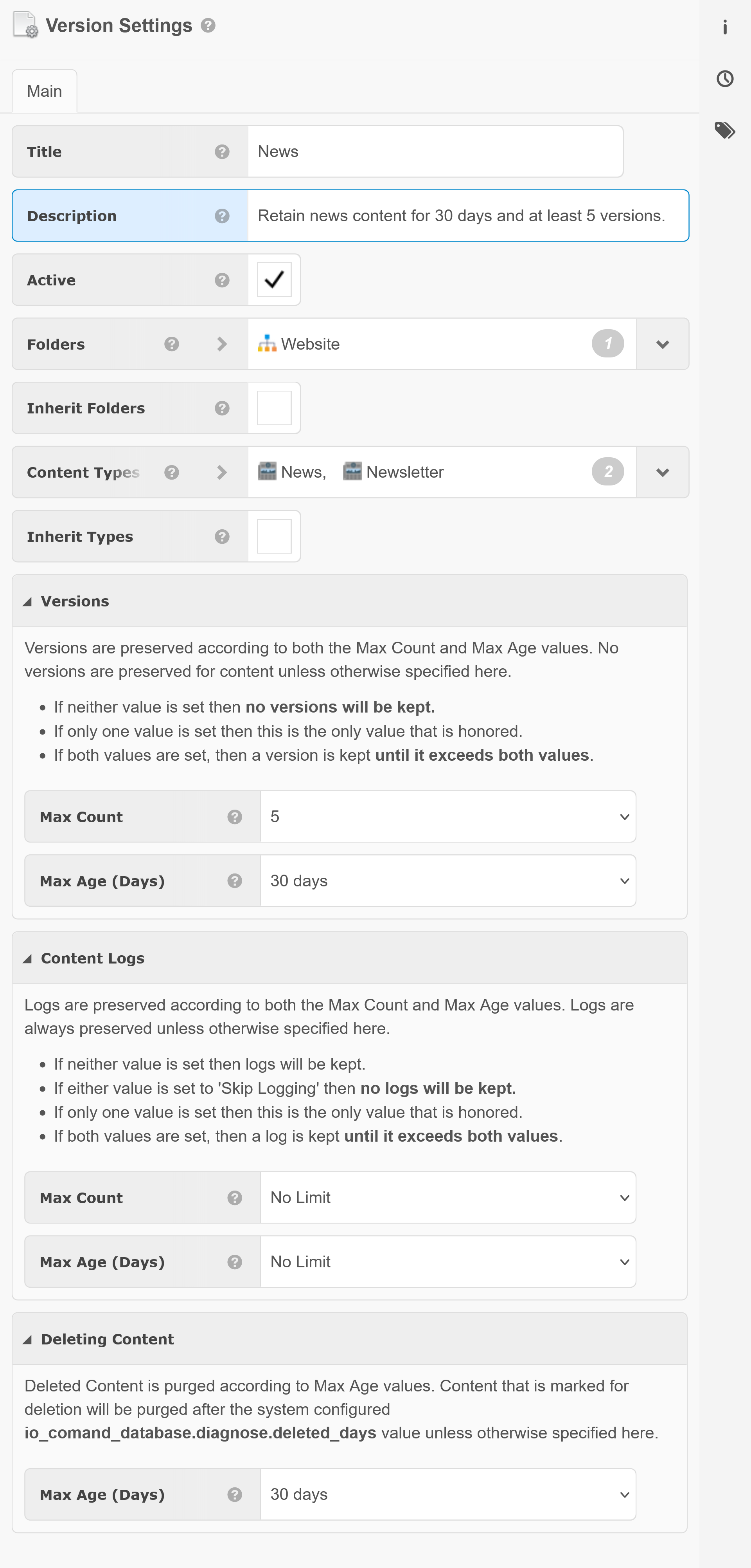 Versions are preserved according to both the Max Count and Max Age values. No versions are preserved for content unless otherwise specified here.