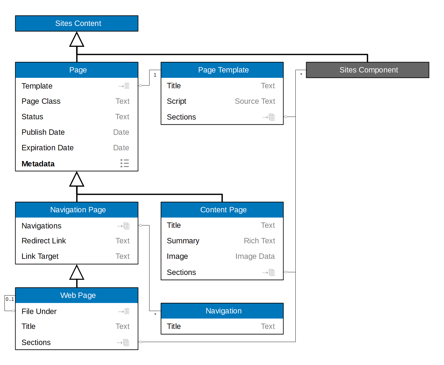 Sites Content is the base content type for all pages and components. When dimensions are enabled, a Language field is added for localization (translation) of all web page text and content. It is also useful for fields that need to reference any web content, whether it is a page or component.