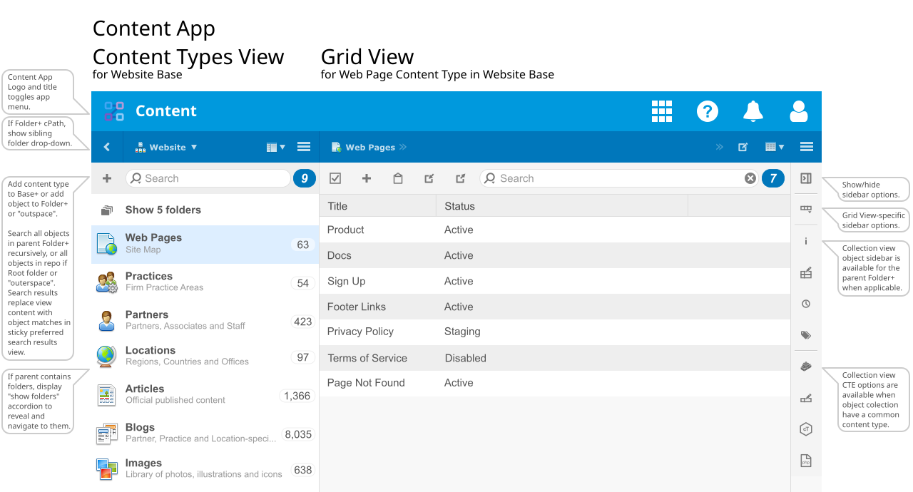 - Edit Content Type - Show/hide the Content Type Sidebar, which provides quick access to edit the main Content Type fields, including: ? This option is only available if the user is authorized to edit the content type.