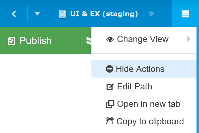 - Selection Workflow Menu - This is only visible to the right of the Select Mode button and drop-down arrow when in Select Mode. If no objects in the collection have unapproved changes, this menu will be collapsed to just the small grey button with chevron icon, which will expand to reveal disabled options, except those that are always allowed, like Preview/Publish. If there are any unsaved objects in the collection, this button should expand to reveal the Save or Save and Preview and become orange. Else if there are any unapproved changes, this button should expand to reveal the Approve or Approve and Preview and become green. If at least one object in the collection allows Preview/Publish than the Save & Preview/Approve & Publish option should be used instead of just Save/Approve.