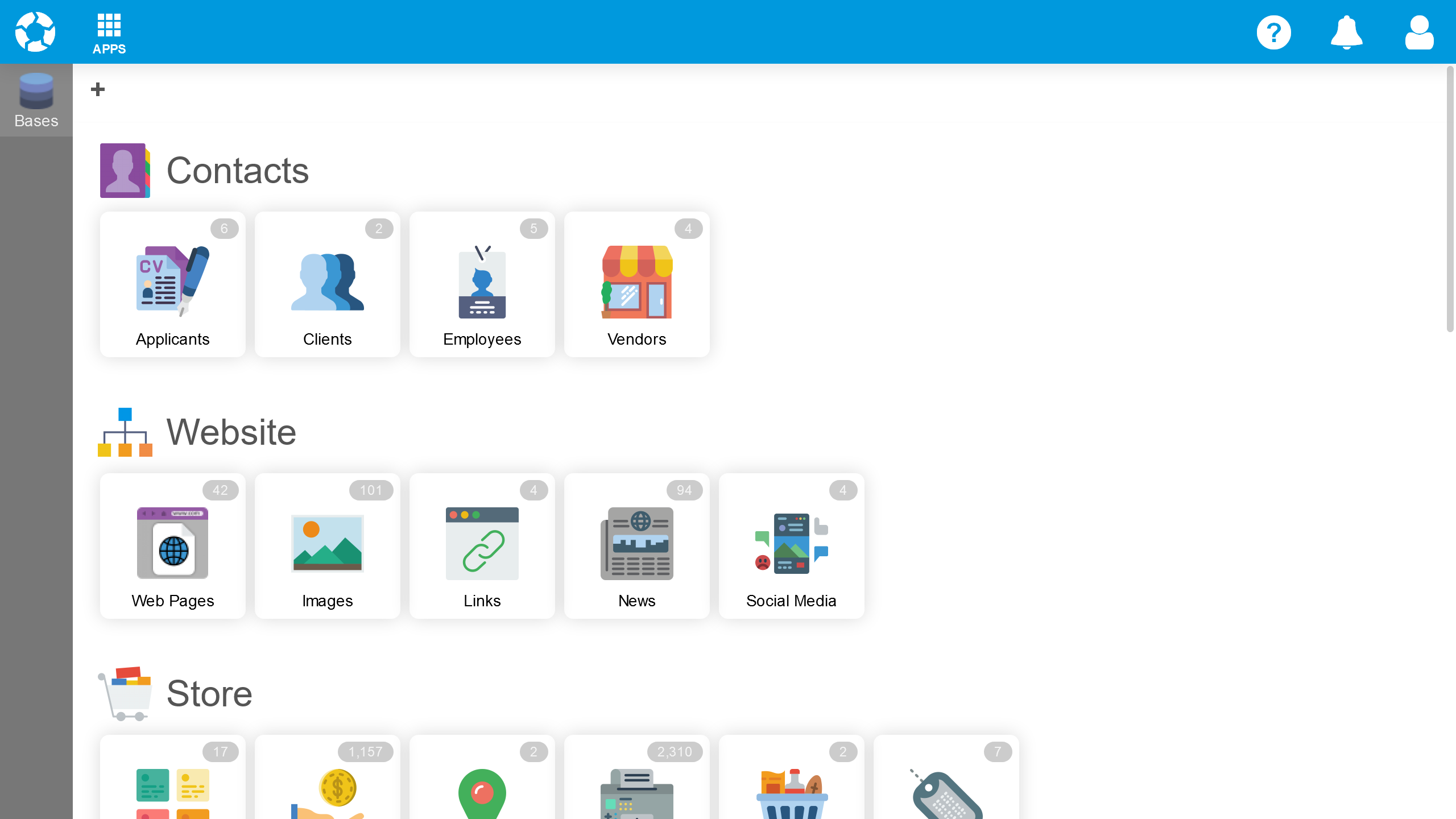 To open a new or existing Base, click its icon or title (ie. "Contacts" or "Website" in screenshot above).