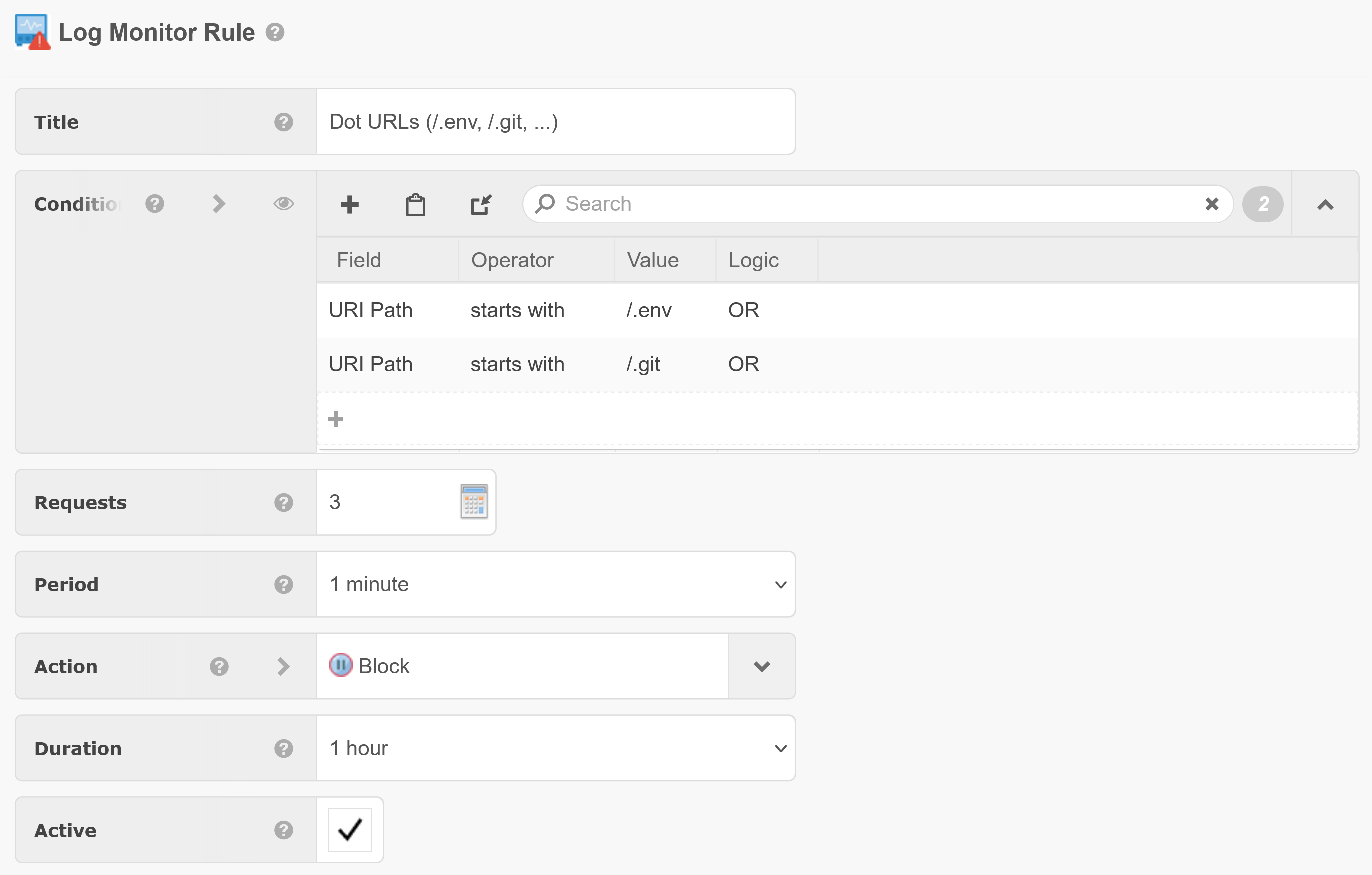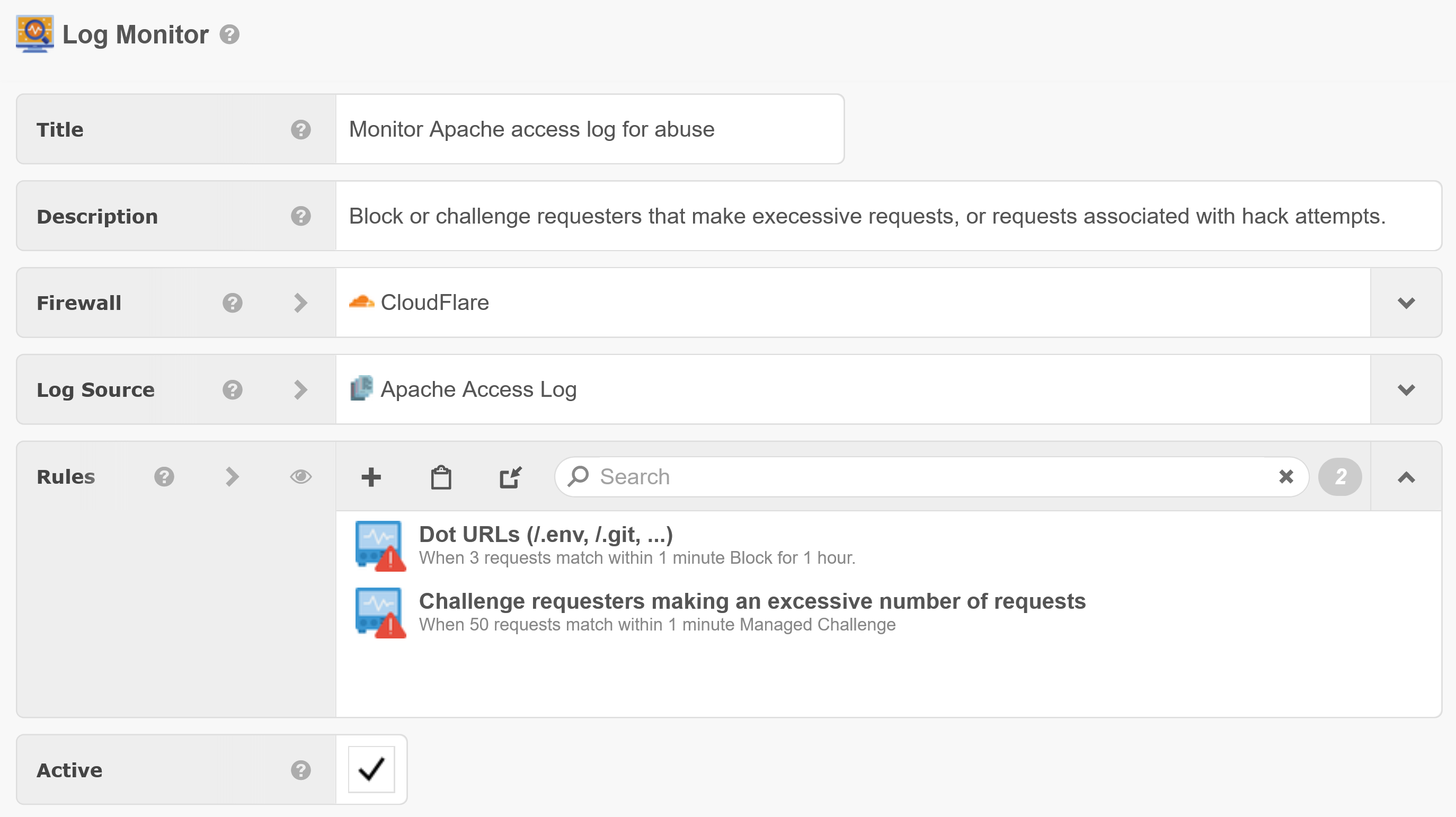 The Log Monitor App is used to review requests written to server log files in order to block, challenge and/or rate limit requesters (by IP address) that violate rules, such as making too many requests in a period of time, or making requests that appear to be malicious.