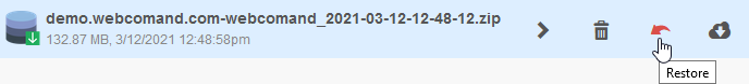 To restore an existing backup, hover over the backup and click the restore option to the right. The backup will be restored, replacing all data in the repository. It may be a good idea to first create a new backup from the current repository before restoring another backup, in case you want to revert the repository data back to what was there before the backup was restored.