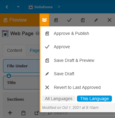 Workflow Menu - Options to update the content's workflow state after modifications are made, including Approve, Save and Revert to Last Approved (and Publish and Preview when applicable). Different options may be available based on your user role and custom workflows. If content modifications are not in the final workflow state (typically approved/published), a colorful shortcut to the next logical workflow step will display to the left of the workflow menu. Click the menu to display all available workflow options. Typical options are: