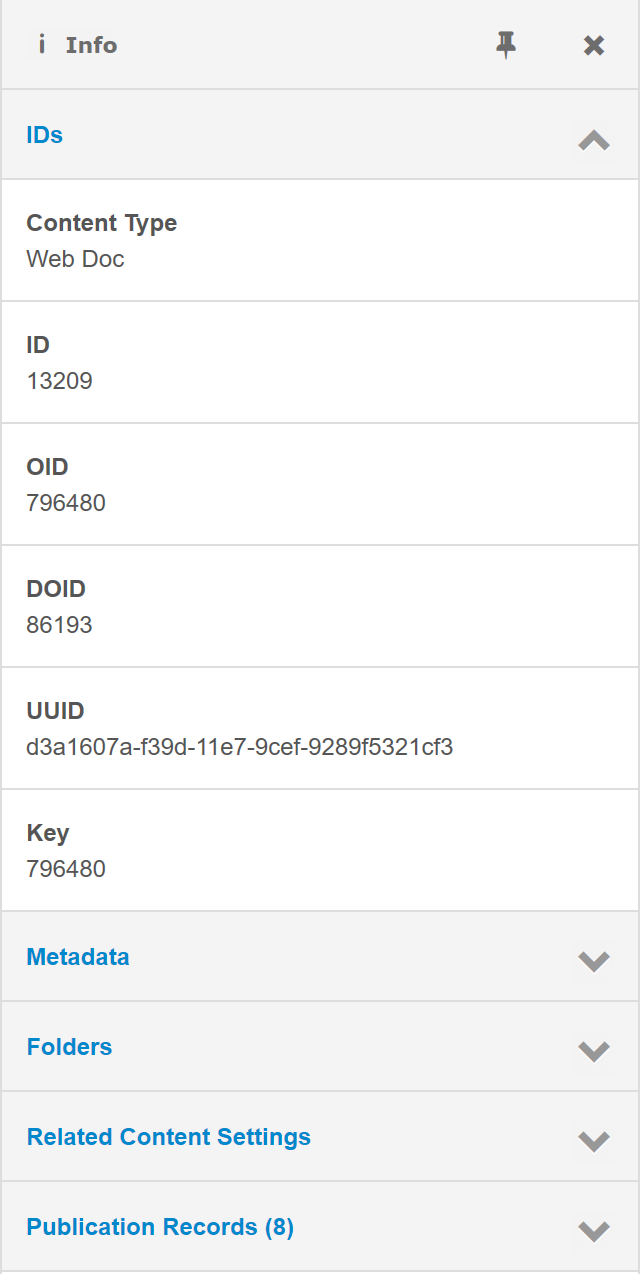 Publication Records associated with the content item. The Publication Records section will not display if no Publication Records are associated with the content item.