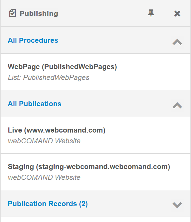 - Publications - Publications with the procedures that can publish this content. Hover over a publication for open and preview or publish options.