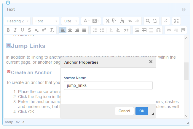 - Anchor - A jump link (see below) to scroll to when the linked page loads. If the web page or URL contains jump links, you can click on the drop-down arrow to the right or start typing to display and select them.