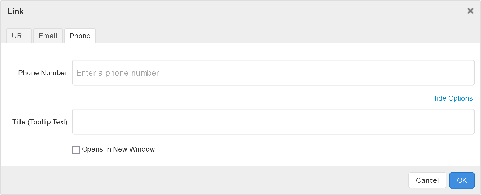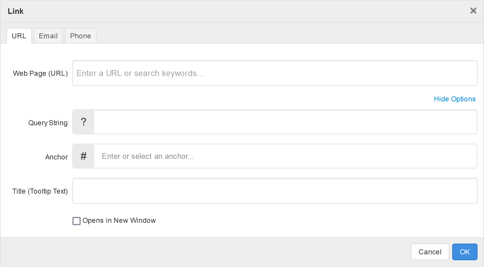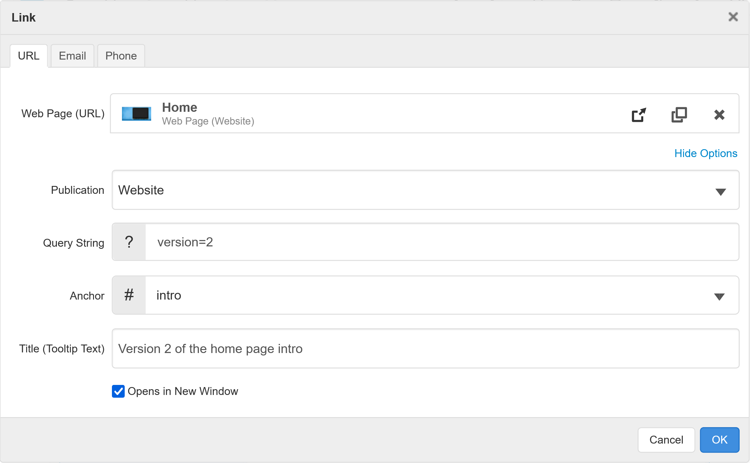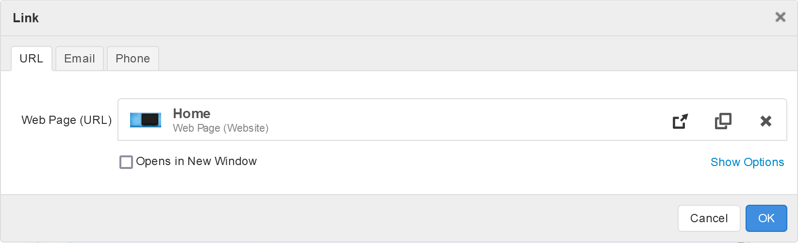- Click "Opens in New Window" to have the link open in a new web browser tab or window.