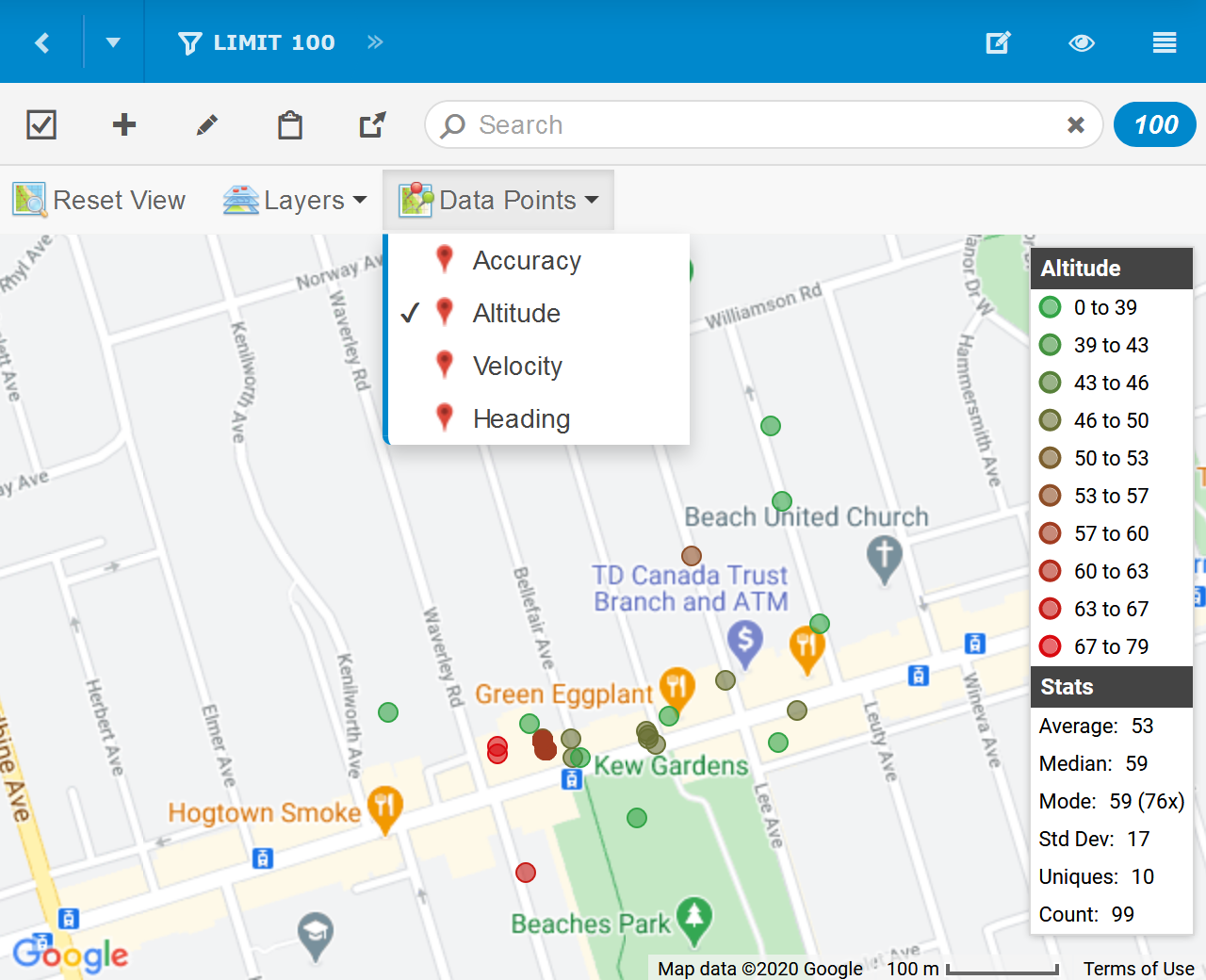 Item's numeric fields will be listed in the Data Points menu. If selected, the item icons on the map will be replaced with colored circles that represent the values of the selected field, as described in the Data Point Key that will overlay the right side of the map. The Data Point Key also includes several high-level statistics about the field values including the Average, Median, Mode, Std Deviation, Unique Value Count and Total Values Count.