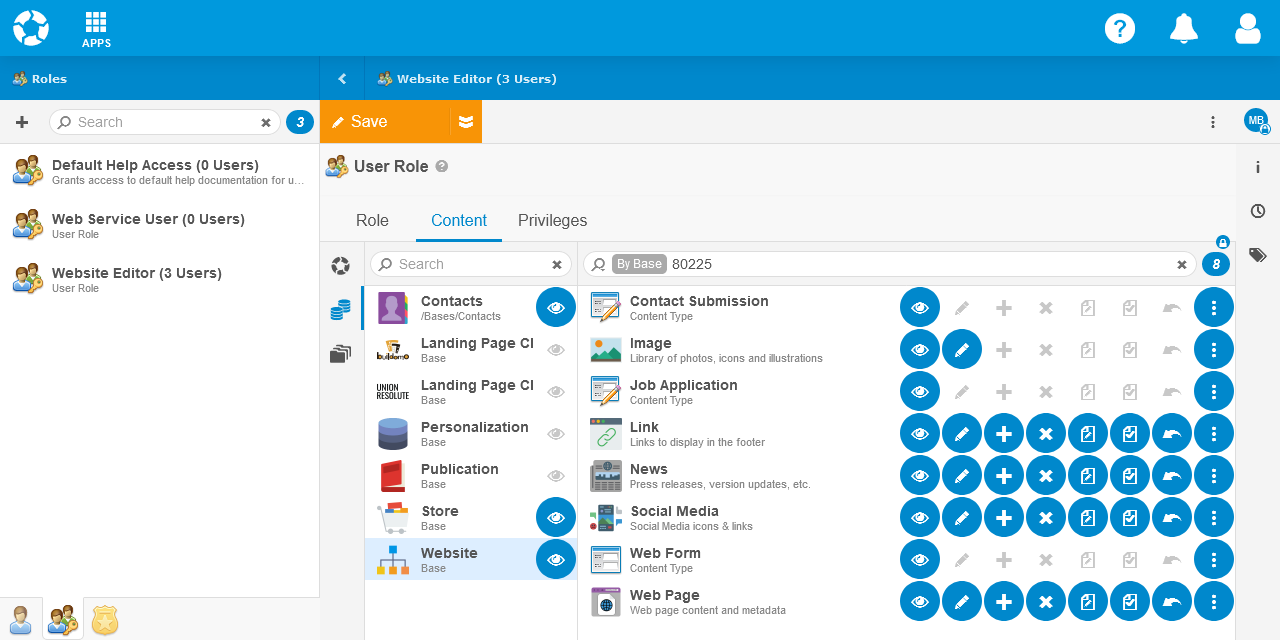 It is now possible to manage user access by Repository, Base and Folder. Field authorizations are now accessible directly from the Content tab, to the right of each content type's authorizations. It is also possible to specify if future fields of a content type should automatically be given read and/or write authorization, per user role and content type. For more information, see the Users App.